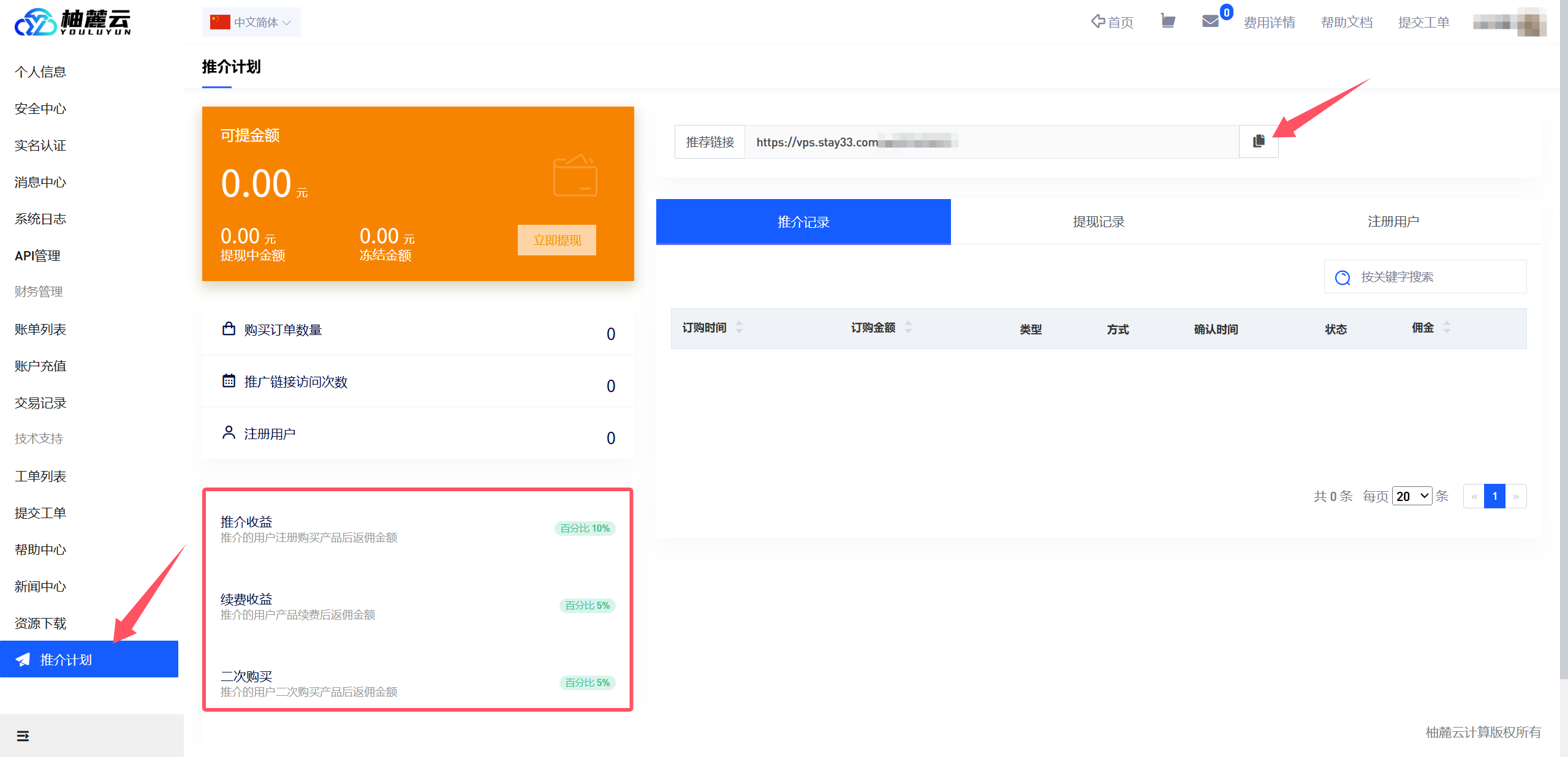 您可登陆账号至用户中心侧边栏最下方的“推介计划”中开启,开启后您可通过分享专属链接让其他用户注册并且购买产品获得收益!